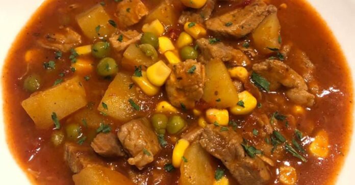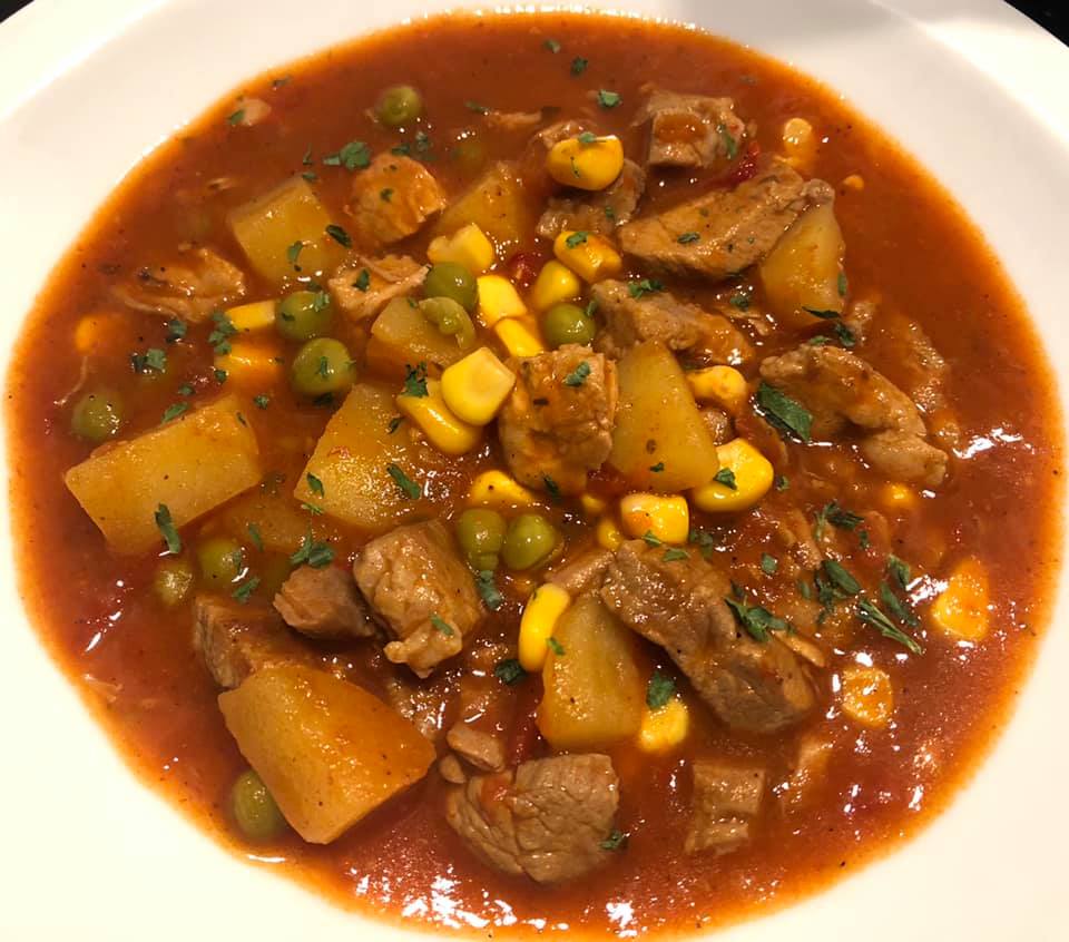 Nem tudom mi ez, de pörköltalappal kezdtem disznóhúst főzni. Tettem hozzá paradicsomot, paprikát, bazsalikomos paradicsomszószt, piros aranyat, paprikakrémet. Mikor puha lett a hús belefőztem a krumplit és öntöttem hozzá egy borsó-kukorica konzervet, sóztam, borsoztam, köménymagot és petrezselymet tettem még az elején bele. Hosszúlével főzve nagyon finom lett.